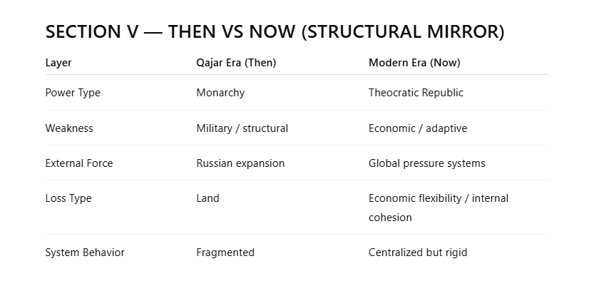 This text presents a geopolitical structural analysis that identifies a recurring cycle of systemic rigidity within the Iranian state across different historical eras.