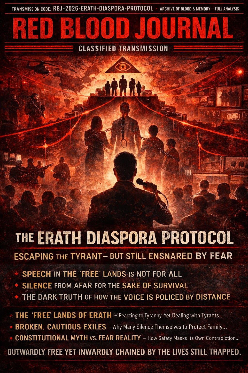 “On Planet Erath, the hierarchy is not enforced only from above. It is preserved across distance. The tyrant rules the homeland by fear, and the empire of virtue tolerates the tyrant through convenience. Between them stands the exile, outwardly free yet inwardly calculating every word against the possible suffering of those left behind. Thus the voice does not die by direct prohibition alone. It withers by responsibility, by memory, by imported fear, and by the learned knowledge that on Erath, one truth spoken openly can become another family’s punishment in silence.”