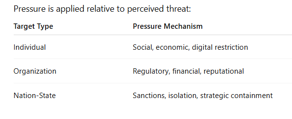 This convergence allows the state to apply individualized sanctions, such as freezing funds or limiting digital visibility, with the same logic once reserved for entire nations.