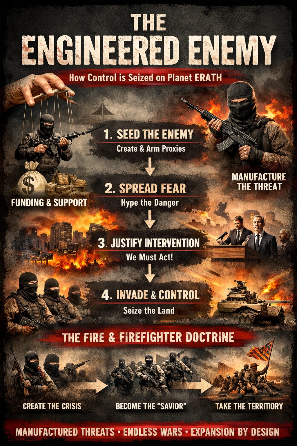 This model, known as the “Fire-and-Firefighter Doctrine,” suggests that power structures may intentionally cultivate or exploit adversaries to make military or political intervention appear necessary.