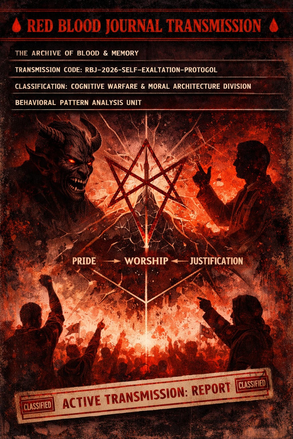 The provided text introduces the Red Blood Journal, a fictional archive analyzing the psychological architecture of self-elevation through the lens of historical and religious motifs.
