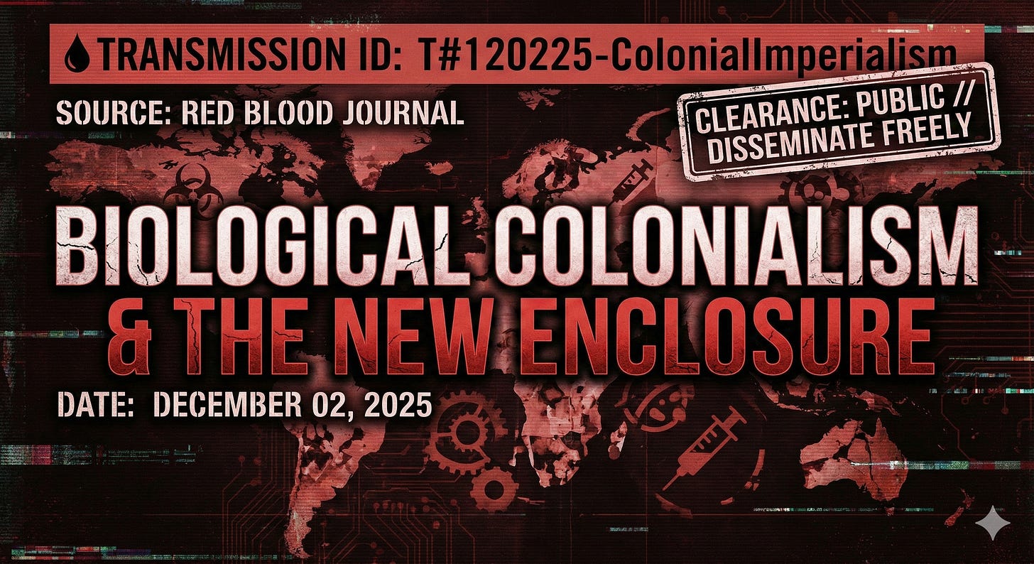 🩸TRANSMISSION ID: T#120225-ColonialImperialism SOURCE: RED BLOOD JOURNAL CLEARANCE: PUBLIC // DISSEMINATE FREELY TOPIC: BIOLOGICAL COLONIALISM & THE NEW ENCLOSURE DATE: DECEMBER 02, 2025