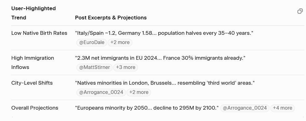 X buzzes with claims that the film’s warnings are manifesting, particularly in Europe’s “turning” demographics. Native Europeans are reportedly becoming minorities in cities like London (40% foreign-born), Brussels (48%), and Amsterdam, with projections for national shifts by mid-century. Low birth rates (1.1–1.6 per woman) and net migration (2.3M annually) are blamed, with users warning of “extinction” by 2050–2100. Cities resemble “third world” enclaves, per some, with calls for remigration and pro-natal policies like Hungary’s. Others see it as inevitable collapse, tied to economic and cultural “suicide.”