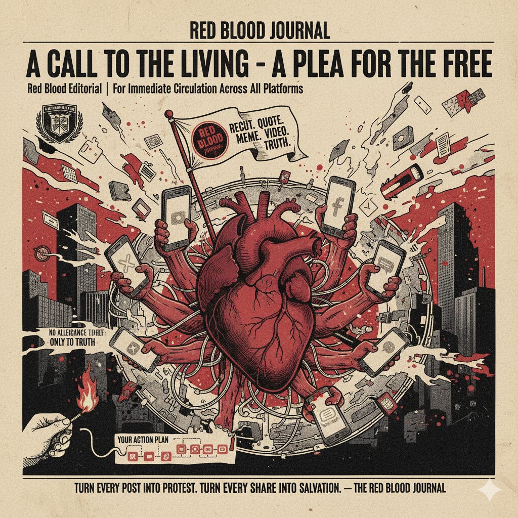 🩸 Empowering Truth: A Grassroots Call to Action for Future GenerationsRed Blood Editorial | For Immediate Circulation Across All PlatformsRed Blood Journal TransmissionOct 24, 2025∙ PaidShareContinue reading this post for free, courtesy of Red Blood Journal Transmission.Claim my free postOr purchase a paid subscription.PreviousNext