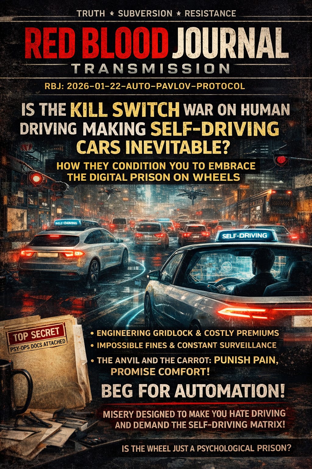 By engineering roadway misery, increasing insurance costs, and mandating surveillance kill-switches, the system supposedly conditions citizens to view human-operated travel as a stressful burden.