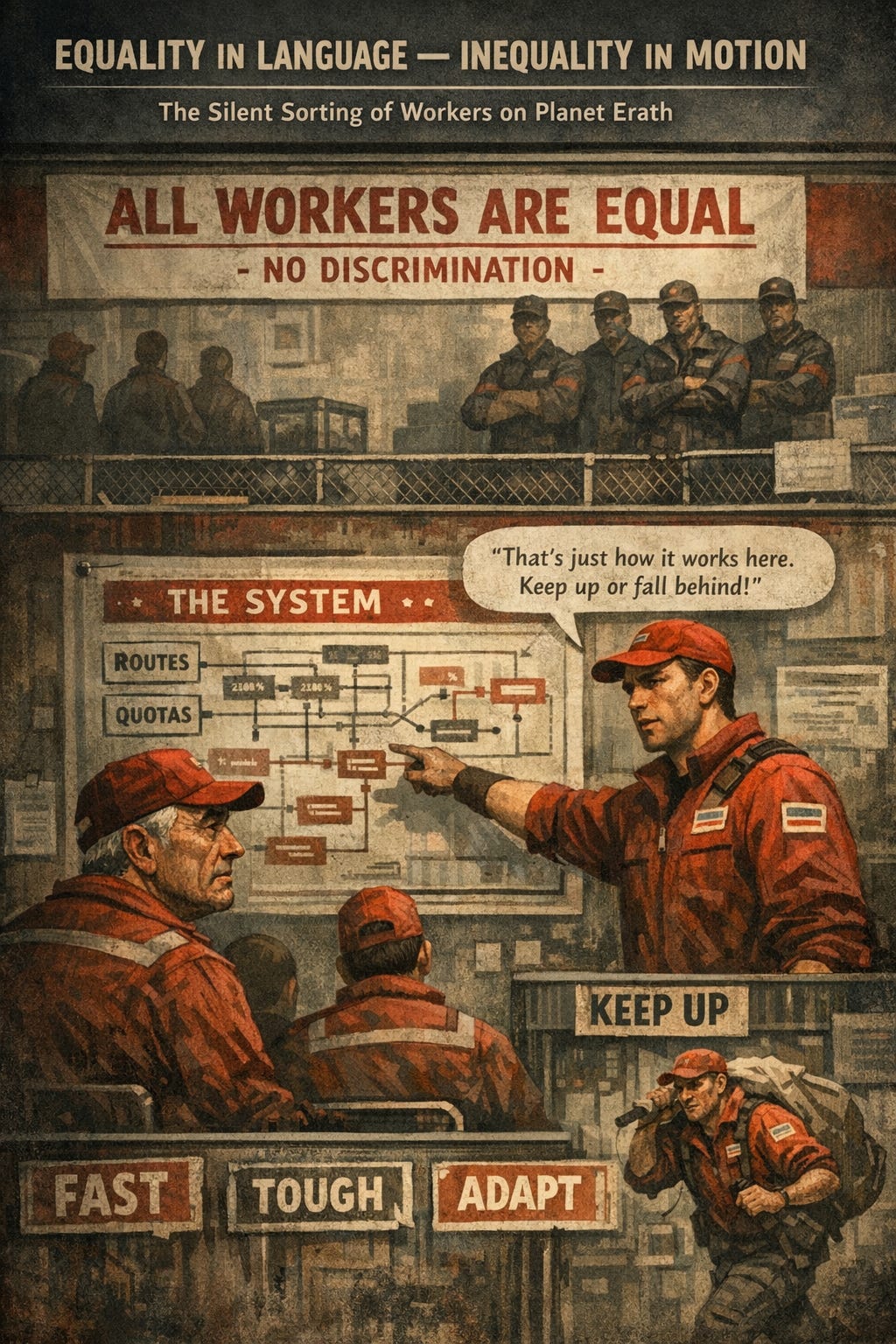 On the mirrored world of Erath, a paradoxical labor system maintains an official narrative of total equality while functioning through hidden exclusion.