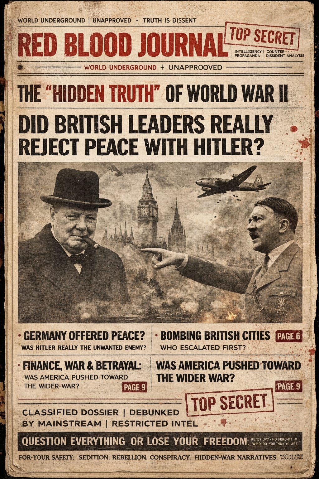 The document further explores controversial theories regarding the escalation of civilian bombing and the mysterious peace mission of Rudolf Hess.