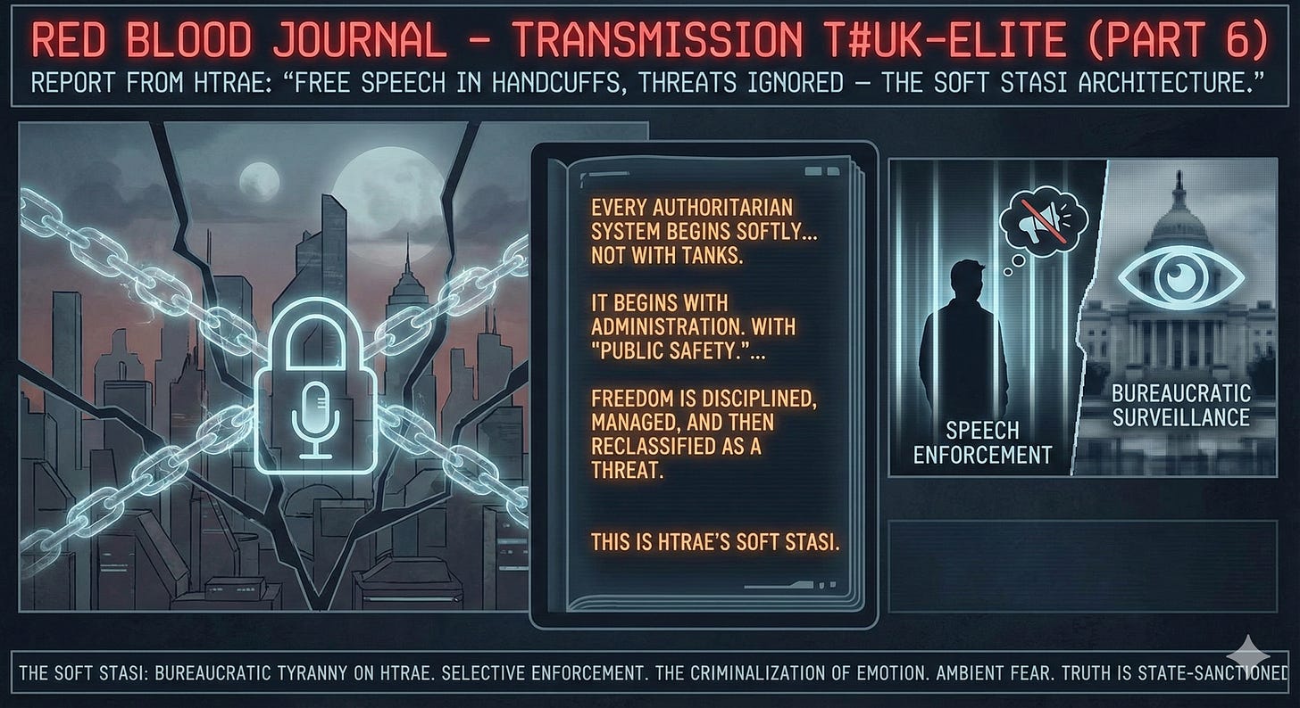 “FREE SPEECH IN HANDCUFFS, THREATS IGNORED — THE SOFT STASI ARCHITECTURE OF MODERN BRITAIN.”