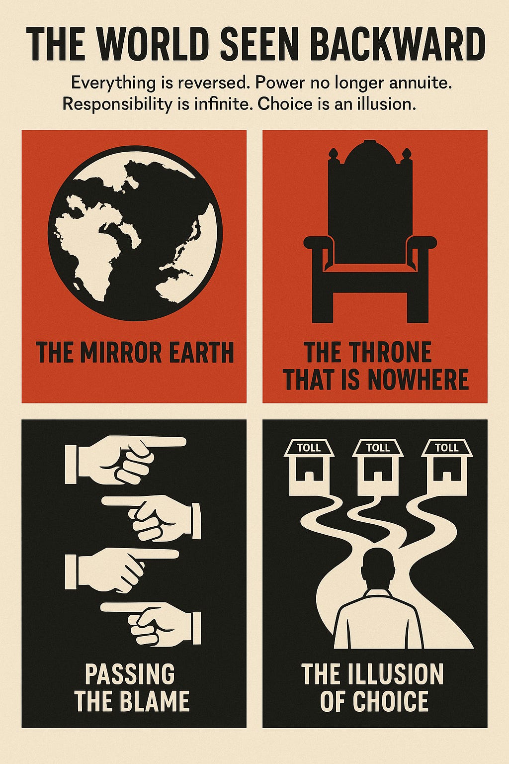 This transmission is allegorical analysis: a reversed lens held to the structures of power, governance, and perception.