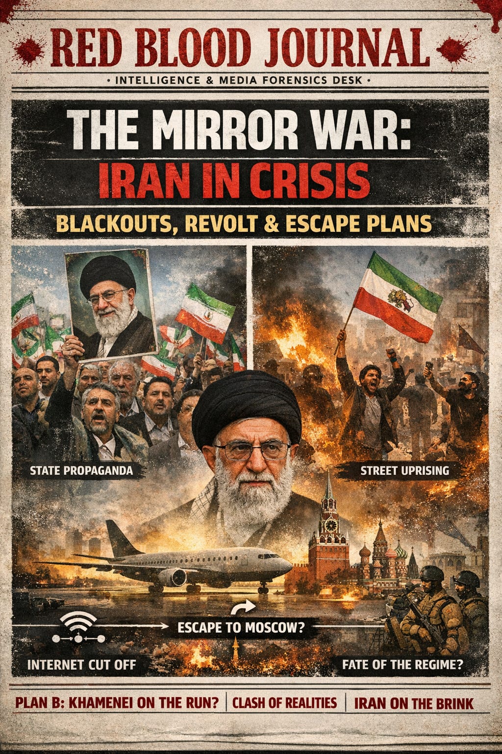 As of January 8, 2026, Iran is engulfed in nationwide protests triggered by economic collapse, with demonstrators demanding regime change amid an internet blackout imposed by the government. Drawing parallels to media manipulation during the 2024 U.S. elections, Iranian state-controlled outlets portray pro-regime rallies, while opposition sources depict widespread anti-government fervor. Speculation abounds that Supreme Leader Ayatollah Ali Khamenei may flee to Russia if security forces falter, echoing historical precedents like the fall of Syrian President Bashar al-Assad in 2024. This report analyzes the past, present, and potential future trajectories, predicting a high likelihood of regime weakening but not immediate collapse, barring defections within the military. Based on diverse sources, the unrest could either be suppressed through brute force or escalate into a revolutionary tipping point by mid-2026.