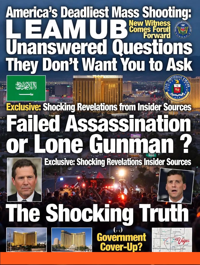 Geopolitical Motive (High Plausibility in Context) MBS was rising fast, challenging old-guard royals and aligning with Trump/U.S. interests. Rivals (e.g., linked to Alwaleed, who owned Four Seasons atop Mandalay Bay) may have targeted him there. Paddock possibly a patsy/arms intermediary (FBI notes on his background). ISIS claim (dismissed officially) could be opportunistic or partial truth (operatives on ground). Cover-up protects U.S.-Saudi alliance (oil, arms, anti-Iran strategy) — explaining rapid narrative lockdown and lack of full disclosure.