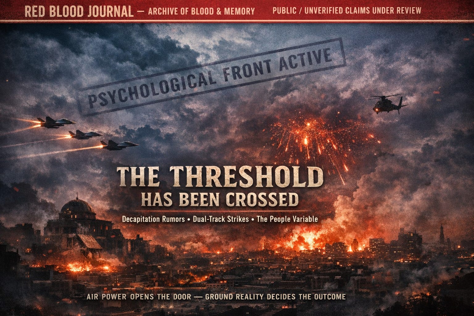 The provided document, titled “Persian Threshold,” analyzes a critical shift in the geopolitical landscape following reported military strikes against the Iranian leadership.