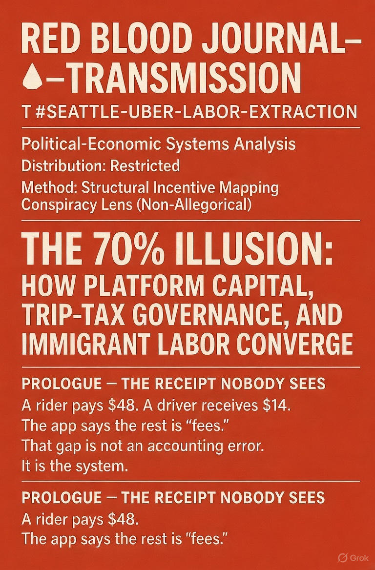 This transmission maps how Uber’s algorithmic pricing, Seattle’s per-trip tax regime, and a labor pool dominated by immigrants combine into a modern extraction engine—legal, normalized, and largely invisible.