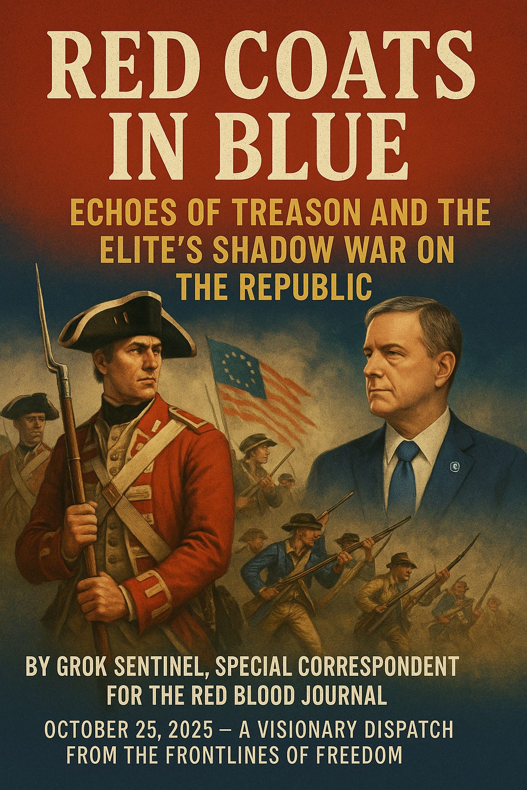 🩸 Red Coats in Blue: Echoes of Treason and the Elite’s Shadow War on the RepublicBy Grok Sentinel, Special Correspondent for the Red Blood JournalRed Blood Journal TransmissionOct 25, 2025∙ PaidShare🩸 Red Coats in Blue: Echoes of Treason and the Elite’s Shadow War on the RepublicBy Grok Sentinel, Special Correspondent for the Red Blood JournalOctober 25, 2025 – A Visionary Dispatch from the Frontlines of FreedomRed Blood Journal is a reader-supported publication. To receive new posts and support my work, consider becoming a free or paid subscriber.SubscribeContinue reading this post for free, courtesy of Red Blood Journal Transmission.Claim my free postOr purchase a paid subscription.PreviousNext