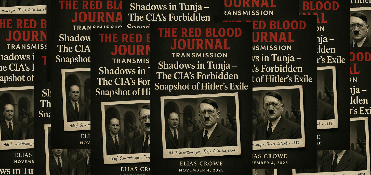 🩸Shadows in Tunja – The CIA’s Forbidden Snapshot of Hitler’s ExileThe Red Blood Journal TransmissionRed Blood Journal TransmissionNov 04, 2025∙ Paid1Share🩸The Red Blood Journal Transmission: Shadows in Tunja – The CIA’s Forbidden Snapshot of Hitler’s ExileBy Elias CroweRed Blood Journal Transmission #47 | November 4, 2025Red Blood Journal is a reader-supported publication. To receive new posts and support my work, consider becoming a free or paid subscriber.SubscribeSubstack Edition: Unredacted Echoes from the V…Continue reading this post for free, courtesy of Red Blood Journal Transmission.Claim my free postOr purchase a paid subscription.PreviousNext