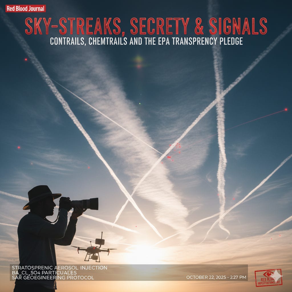 🩸Sky-Streaks, Secrecy & Signals: Contrails, Chemtrails and the EPA Transparency PledgeRed Blood Journal Special ReportRed Blood Journal TransmissionOct 24, 2025∙ PaidShare🩸 Red Blood Journal Special ReportSky-Streaks, Secrecy & Signals: Contrails, Chemtrails and the EPA Transparency PledgeDate: October 22, 2025 @ 6:27 PMByline: Red Blood Investigations UnitContinue reading this post for free, courtesy of Red Blood Journal Transmission.Claim my free postOr purchase a paid subscription.PreviousNext