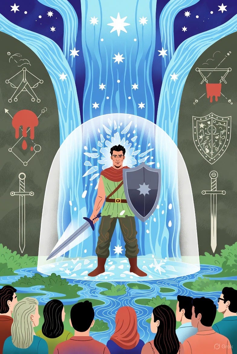Mechanism: One warrior stands, shield raised, sword drawn—glowing from within. The dome cracks. Waters flood. Voices rise as one.