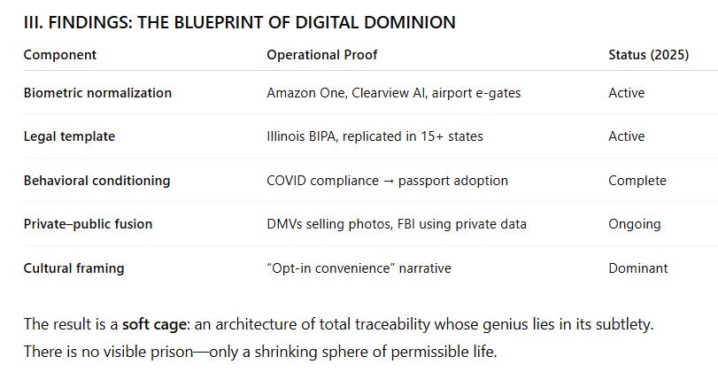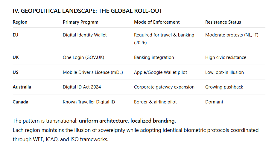 The COVID-19 era served as the prototype: mandates were socialized through apps, QR codes, and digital credentials. Once obedience was established, the same infrastructure was repurposed for permanent biometric identification.
