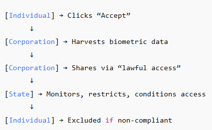 At the core of the system lies a biometric supply chain linking citizens, corporations, and governments in a feedback loop of consent: