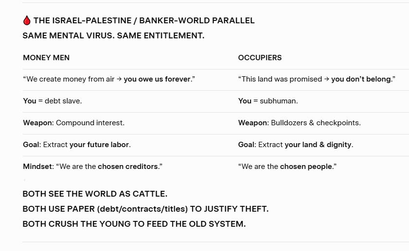 Gaza 2025: 2.3M people in open-air prison → 43% youth unemployment, 60% food insecurity. → Same outcome as Detroit ghettos: despair → drugs → crime. → Same cause: extractive system (settler debt or banker debt).