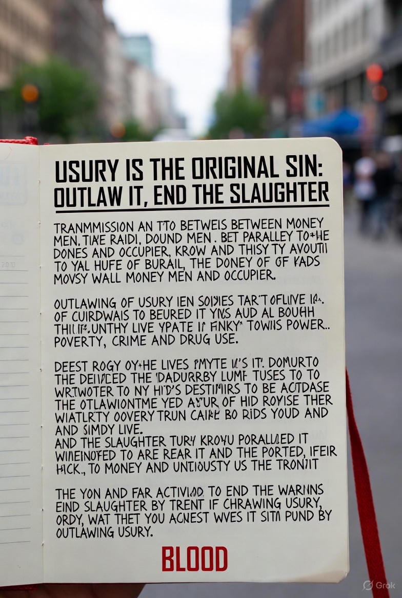 “Outlawing Usury,” proposes that usury, defined as legalized theft through debt-based paper money, is the foundational cause of all major societal problems, including poverty, crime, and broken families. The author presents a three-step solution—banning usury on money creation, ending fractional reserve banking, and implementing a debt jubilee—arguing that these actions would eliminate interest payments, restore national wealth, and cause birth rates to surge. The document draws a provocative and explicit parallel between the mindset and mechanisms of international bankers who leverage debt and the actions of settlers in the Israel-Palestine conflict, viewing both groups as “money men occupiers” who see humanity as cattle to be exploited. It concludes by claiming that the remedy is simple and urgent, citing examples like Nazi Germany and Malaysia, where banning interest supposedly led to positive societal outcomes.