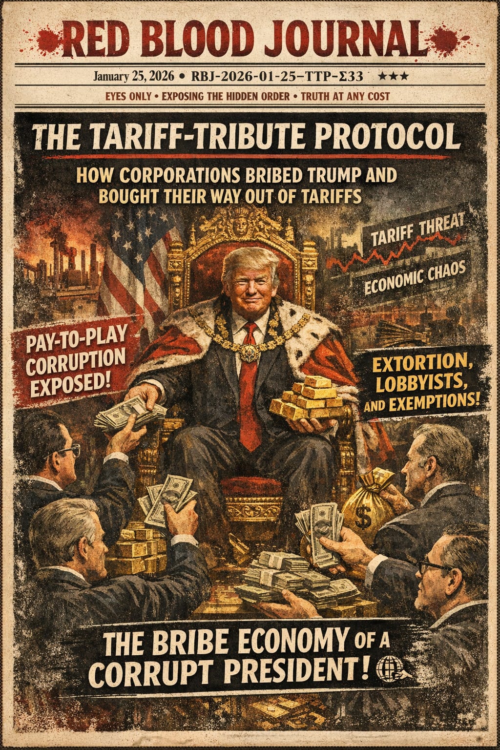 The provided text outlines a systemic monetization of executive power termed the Tariff-Tribute Protocol, which allegedly transformed the United States government into a transactional marketplace between 2025 and 2026.