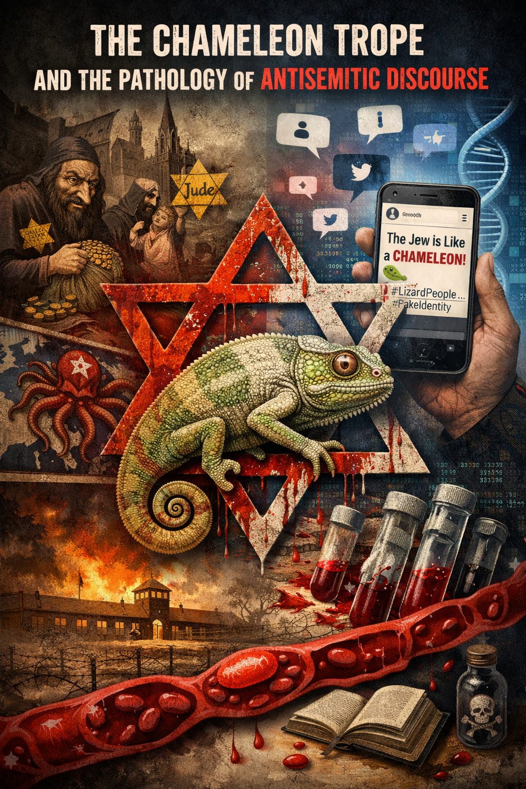 Antisemitism, a term coined in 1879 by Wilhelm Marr to denote racialized hatred against Jews, remains a persistent societal pathology distinct from broader linguistic or cultural prejudices against Semitic peoples. This report examines the “chameleon” metaphor—a trope accusing Jews of deceptive adaptability and shape-shifting—as a modern manifestation of antisemitic stereotypes. Drawing on historical origins, etymological distinctions between “Semitic” and “antisemitism,” and contemporary examples from social media platforms like X (formerly Twitter), we analyze how this metaphor perpetuates conspiracy theories rooted in deception and disloyalty. Through a multidisciplinary lens combining linguistics, history, and digital sociology, we highlight the trope’s evolution from medieval dehumanization to current online discourse. Implications for societal “blood health”—metaphorically representing cultural vitality and resistance to prejudicial toxins—are discussed, with recommendations for education and policy. Key findings include the trope’s alignment with historical blood libels and its amplification in digital spaces.