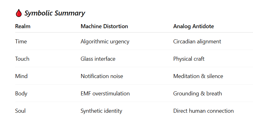 Bio-Reconnection: Sunlight, soil, human voices — these re-anchor the nervous system in analog reality.