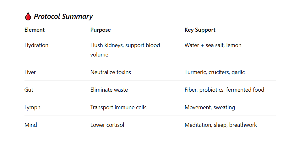 The goal is to enhance liver, kidney, lymph, and gut efficiency, not to “flush” everything indiscriminately — because over-flushing (with diuretics, extreme fasting, etc.) can actually harm these systems.