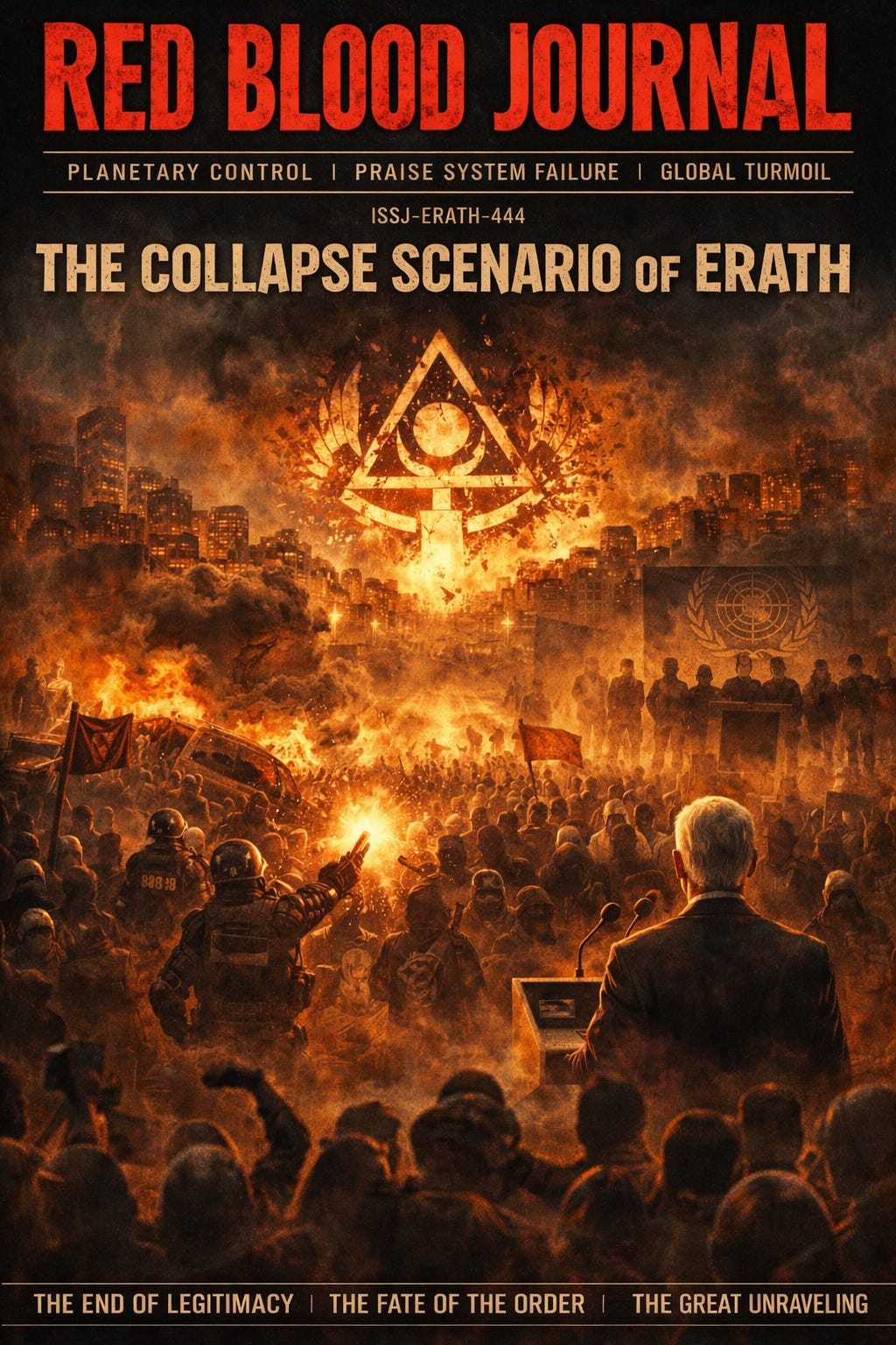 The provided text details the theoretical downfall of a global regime on the planet Erath, which maintains power through the strict manipulation of information and forced public devotion.