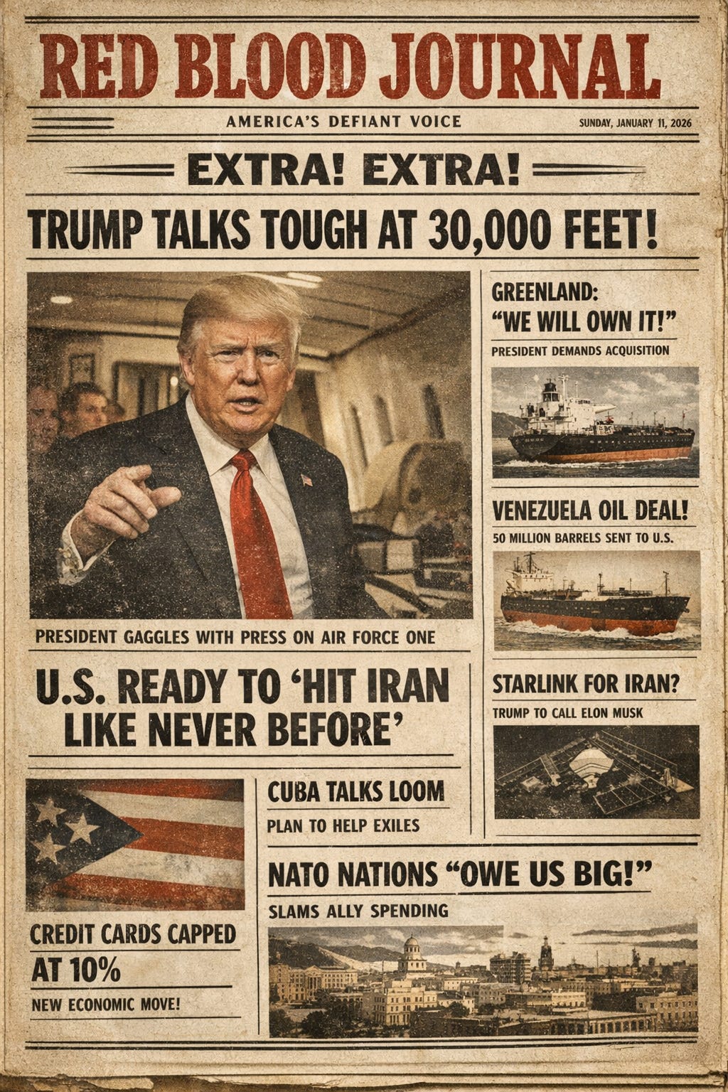 The airborne press gaggle aboard Air Force One on Jan. 11, 2026 reveals President Trump operating in full geopolitical strike posture: