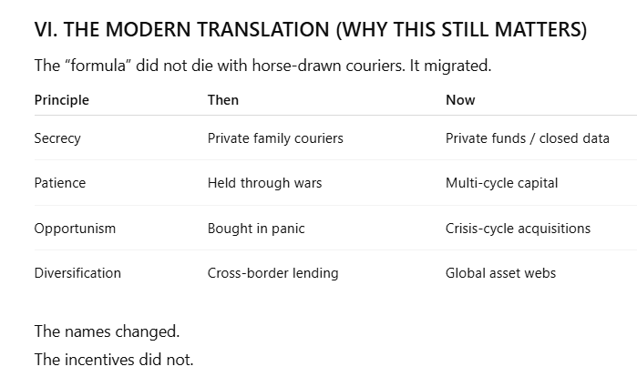 This transmission does not allege sorcery, bloodlines, or supernatural control. It documents a method—quiet, patient, compounding—attributed to the early European banking order and crystallized in the lore surrounding Mayer Amschel Rothschild and Nathan Mayer Rothschild.
