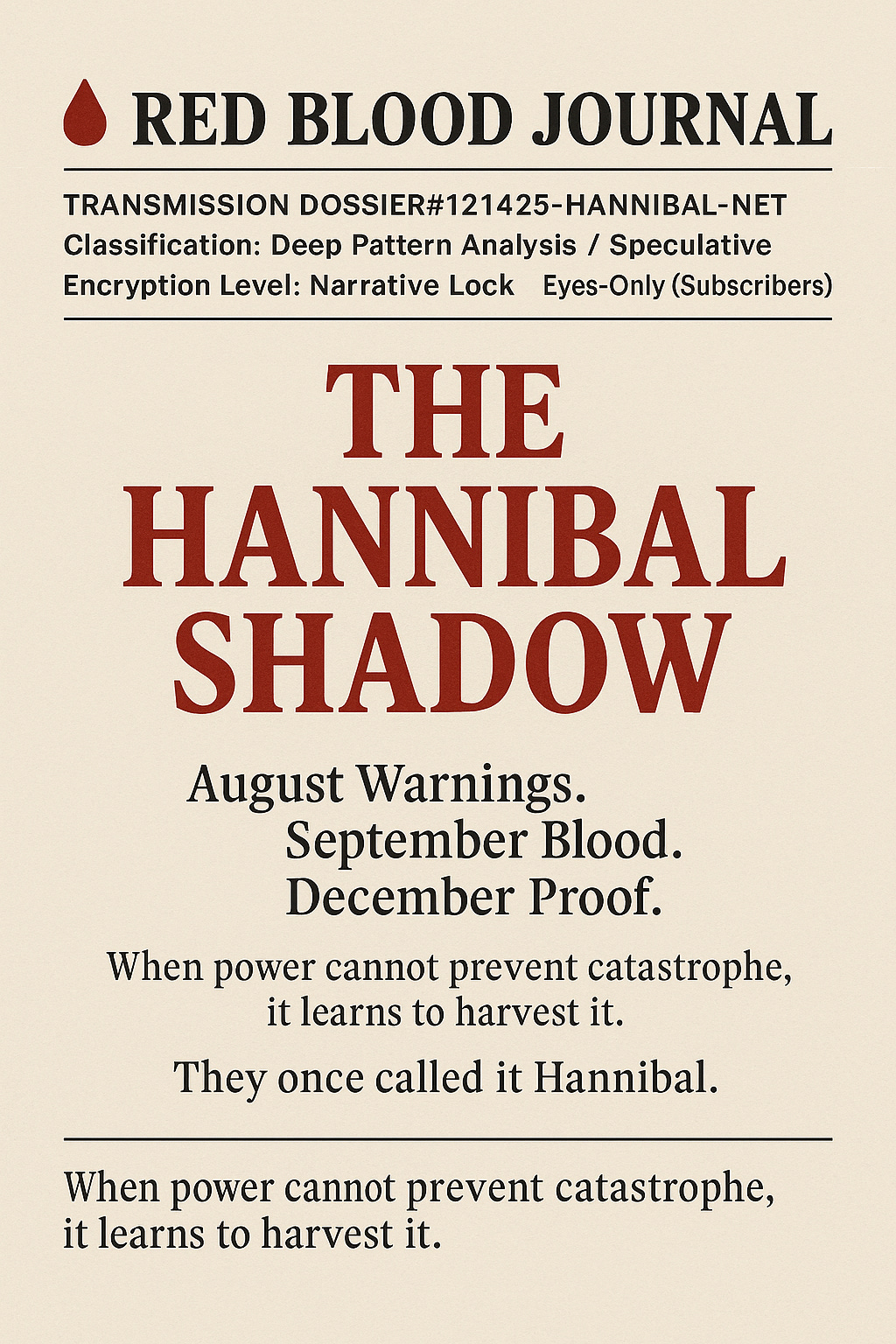 The provided text is an excerpt from a speculative deep pattern analysis titled “The Hannibal Shadow: Crisis as Control Doctrine,” distributed via an encrypted Red Blood Journal transmission.