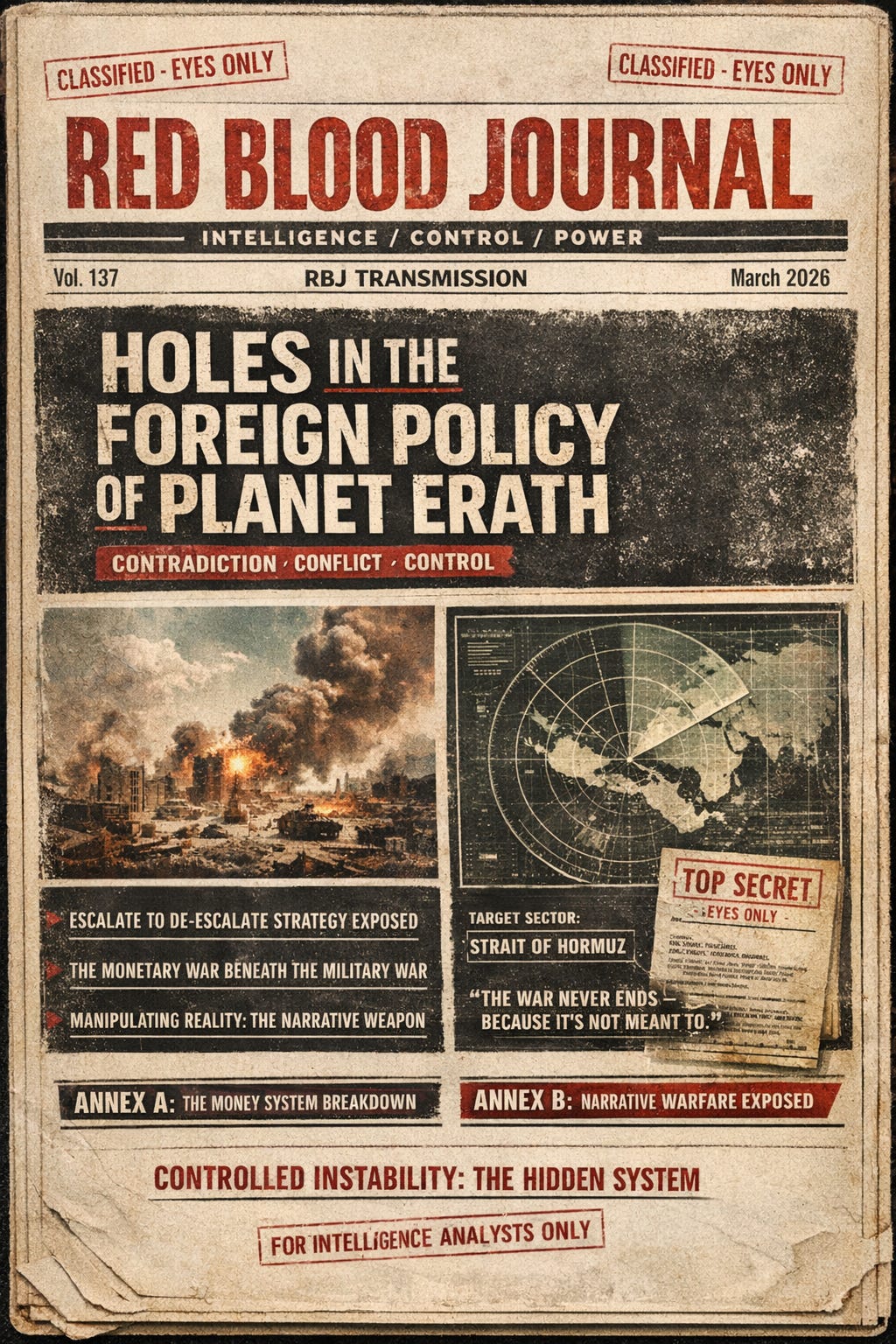 This text describes a cynical framework of geopolitical control on the fictional planet Erath, where foreign policy is designed to maintain permanent instability rather than achieve peace.