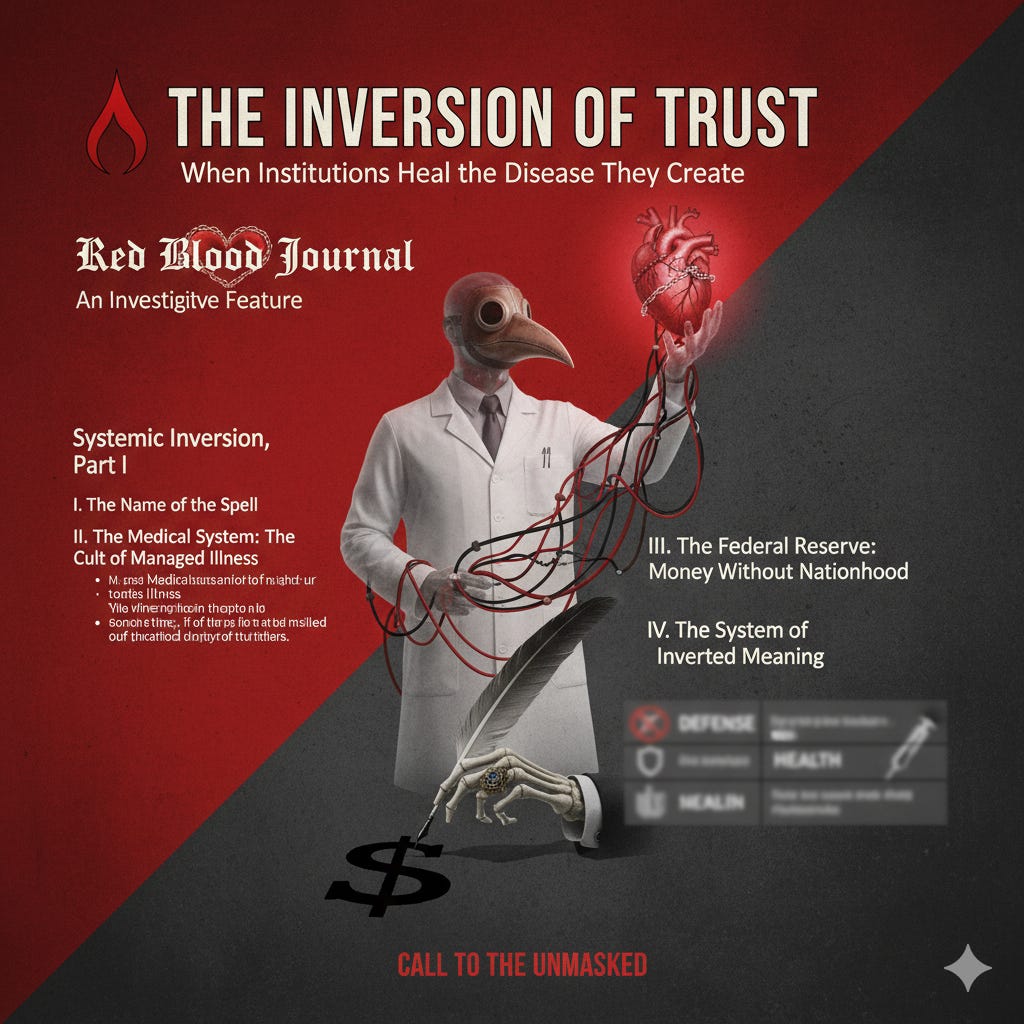 🩸 The Inversion of Trust: When Institutions Heal the Disease They CreateSeries: Systemic Inversion, Part IRed Blood Journal TransmissionOct 31, 2025∙ Paid2Share🩸 The Inversion of Trust: When Institutions Heal the Disease They CreateA Red Blood Journal Investigative FeatureSeries: Systemic Inversion, Part II. The Name of the SpellEvery great deception begins with a label.Red Blood Journal is a reader-supported publication. To receive new posts and support my work, consider becoming a free or paid subscriber.SubscribeTh…Continue reading this post for free, courtesy of Red Blood Journal Transmission.Claim my free postOr purchase a paid subscription.PreviousNext