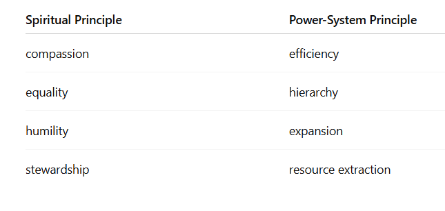 These systems are evaluated through a spiritual lens, contrasting the cold efficiency of power with the moral values of compassion and justice.