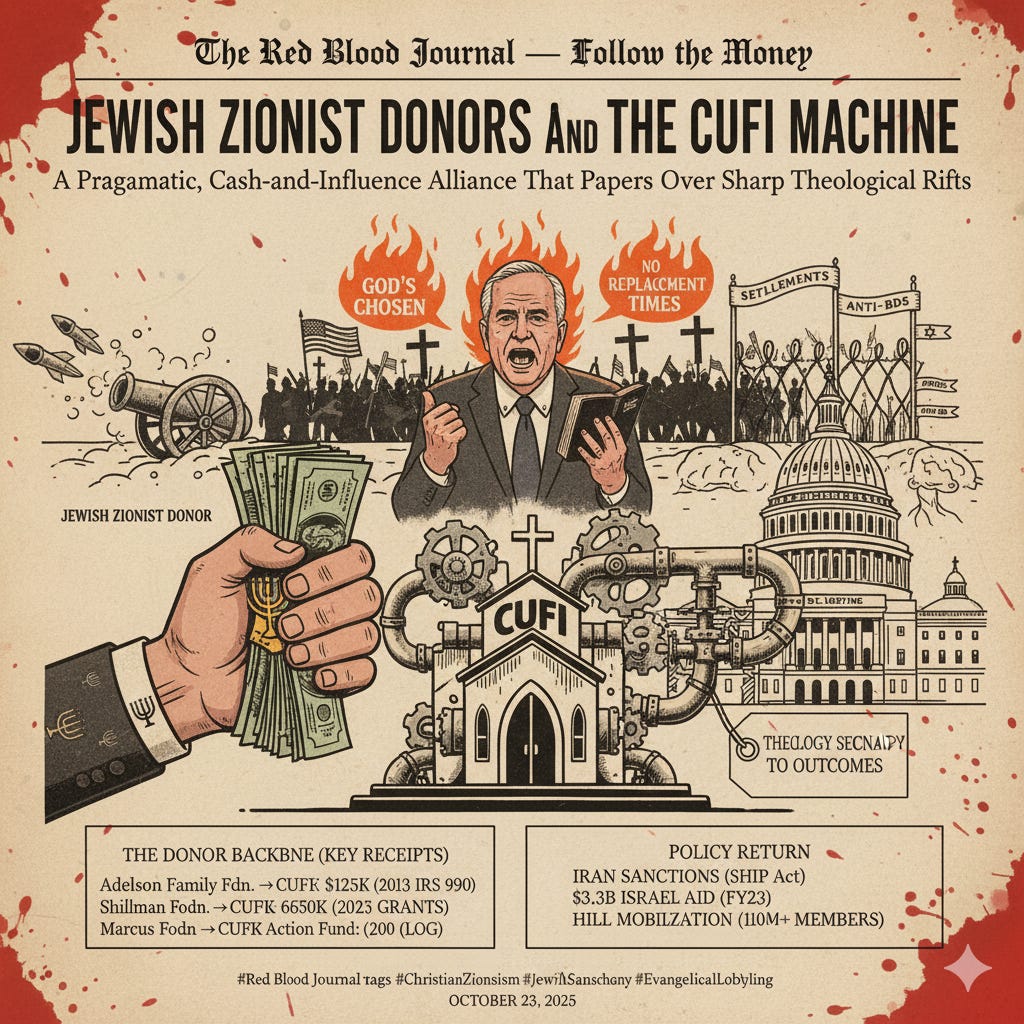 Christians United for Israel (CUFI) markets itself as a biblical grassroots army 10-million strong. But its clout in Washington isn’t powered by church offerings alone. Year after year, major Jewish Zionist philanthropies underwrite CUFI’s policy push—especially on …