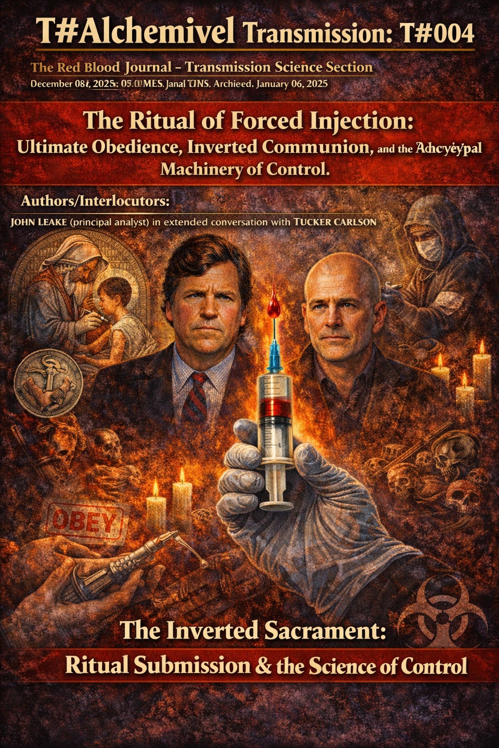 This text presents a provocative analysis by John Leake and Tucker Carlson, who argue that mass vaccination functions less as a medical necessity and more as a secular ritual of submission.