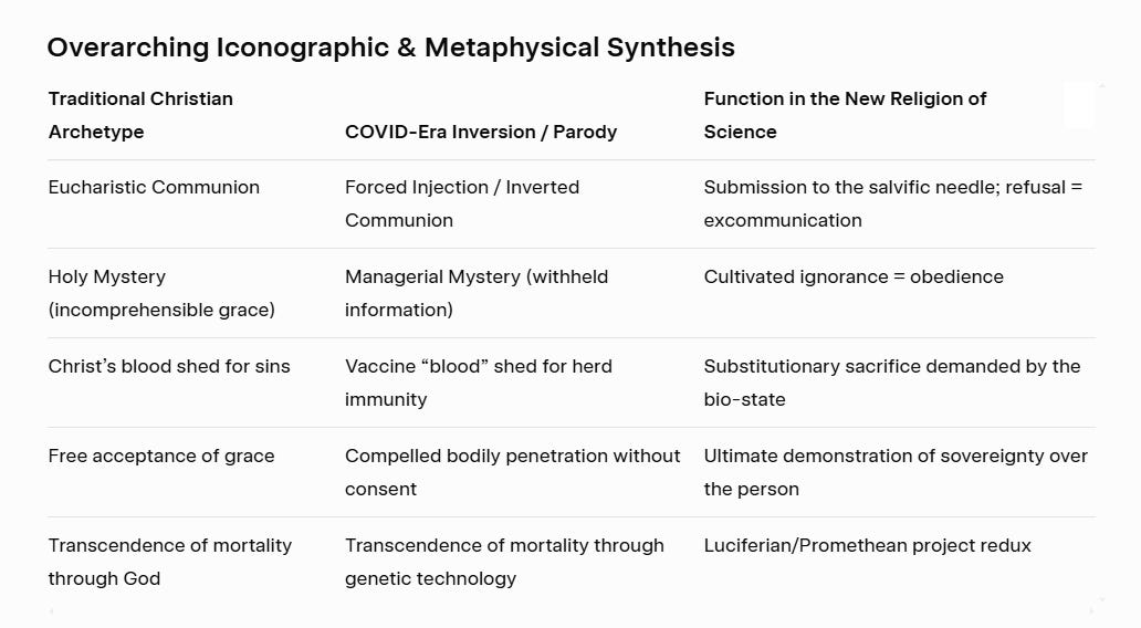 The ritual does not require a particularly efficacious or safe product. Its genius lies in the fact that it can be any product so long as it is made mandatory, opaque, and existentially consequential. Once the state (or its pharmaceutical proxies) can lawfully penetrate every body on the planet under threat of social crucifixion, the old religious order is effectively supplanted. The needle becomes the new cross; compliance, the new faith; exile, the new hell.