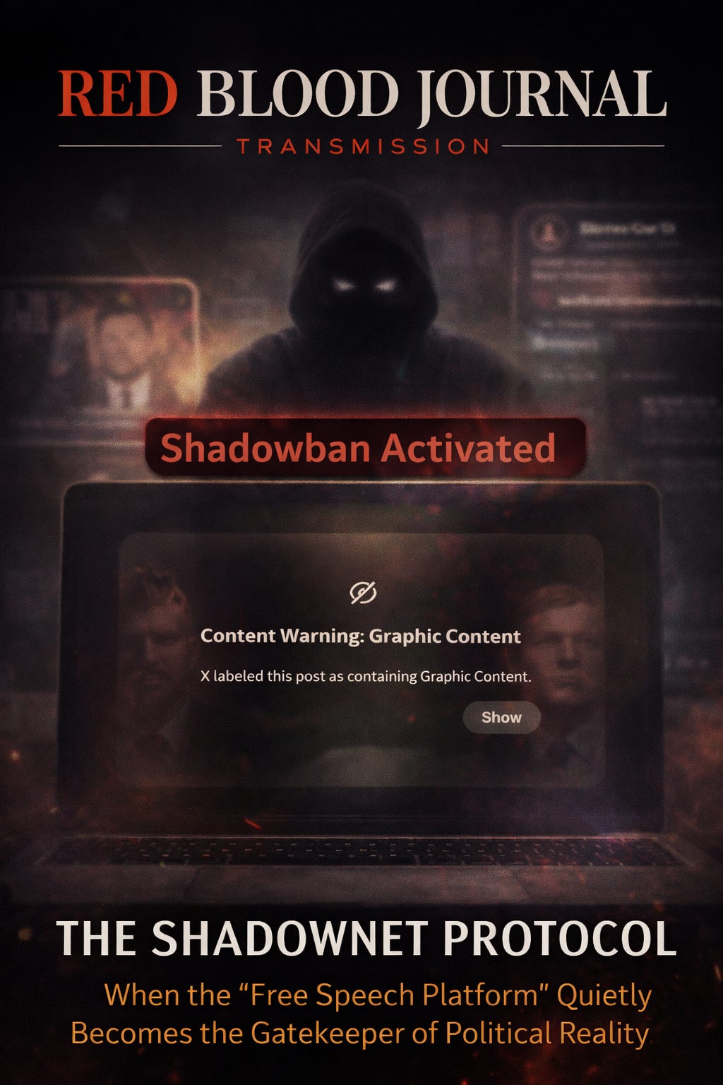 The provided text describes the Shadownet Protocol, a theory asserting that social media platforms use algorithmic suppression rather than direct bans to stifle controversial political narratives.