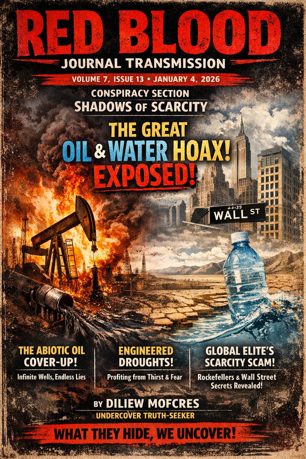 Greetings, fellow awakeners. This is Diliew Mofcres reporting from the hidden trenches of the Red Blood Journal. In a world where the elite puppeteers pull strings from gilded towers, I’ve dug deep into the muck of manipulated realities. Today’s transmission uncovers the grand deception surrounding our planet’s lifeblood: oil and water. They’ve sold us scarcity to line their pockets, but the cracks in their facade are widening. Armed with leaked intel, suppressed science, and whispers from the digital underground, I’ll expose how the Rockefellers, Wall Street vultures, and globalist cabals have engineered a hoax that’s bled us dry—for profit. Buckle up; the truth flows like the resources they’ve hidden.