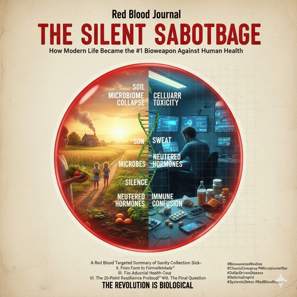 🩸 The Silent Sabotage: How Modern Life Became the #1 Bioweapon Against Human Health A Red Blood Targeted Summary of Sanity Collection Sick-Red Blood Journal TransmissionNov 03, 2025∙ Paid1Share🩸 The Silent Sabotage: How Modern Life Became the #1 Bioweapon Against Human HealthRed Blood Journal is a reader-supported publication. To receive new posts and support my work, consider becoming a free or paid subscriber.Subscribe A Red Blood Targeted Summary of Sanity Collection Sick-Continue reading this post for free, courtesy of Red Blood Journal Transmission.Claim my free postOr purchase a paid subscription.PreviousNext