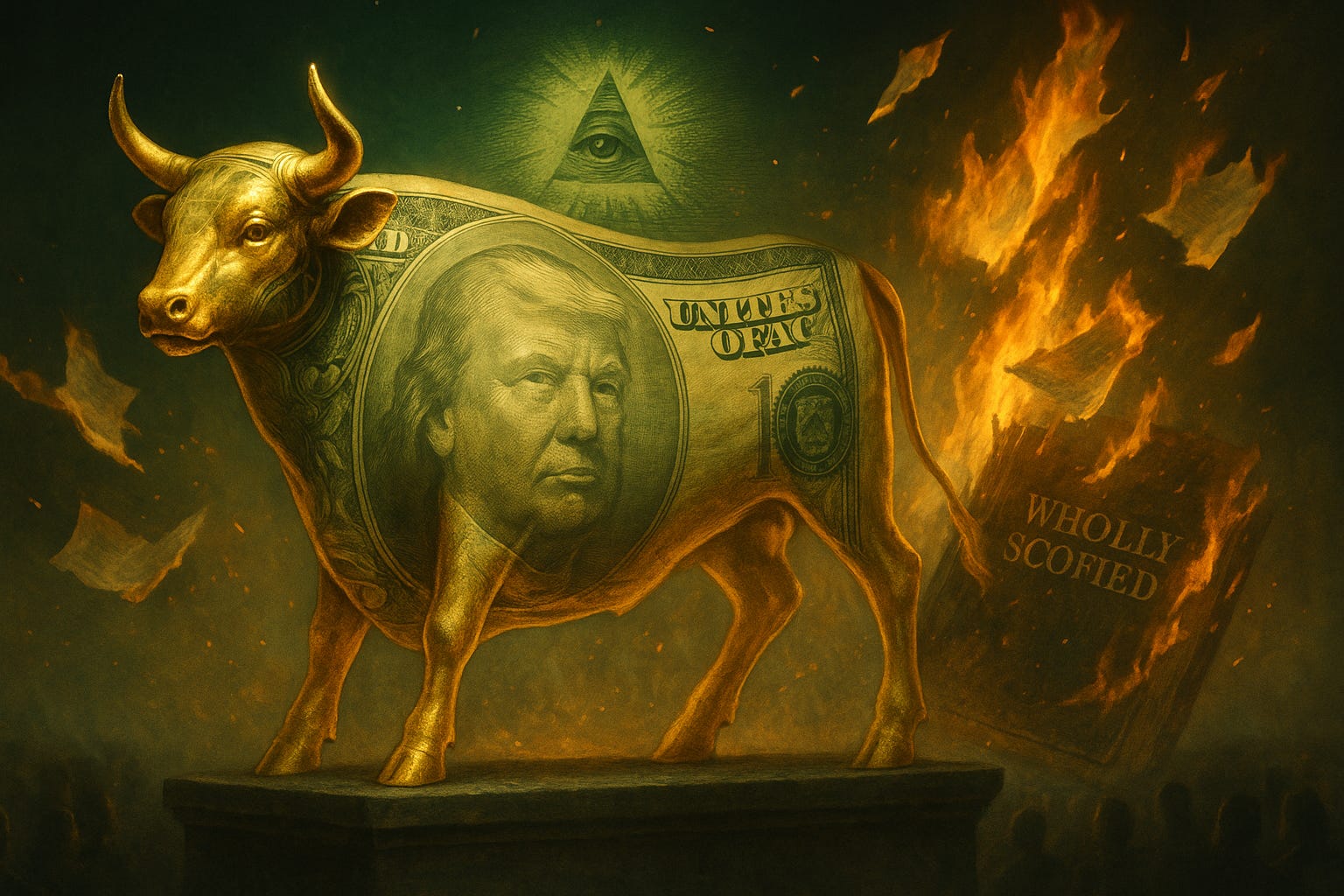 The campaign hat was red, the stage gilded, the promise biblical. Yet beneath the chants and flags, the altar was made of green paper—sacred, numbered, and sealed with a pyramid and a godless eye.