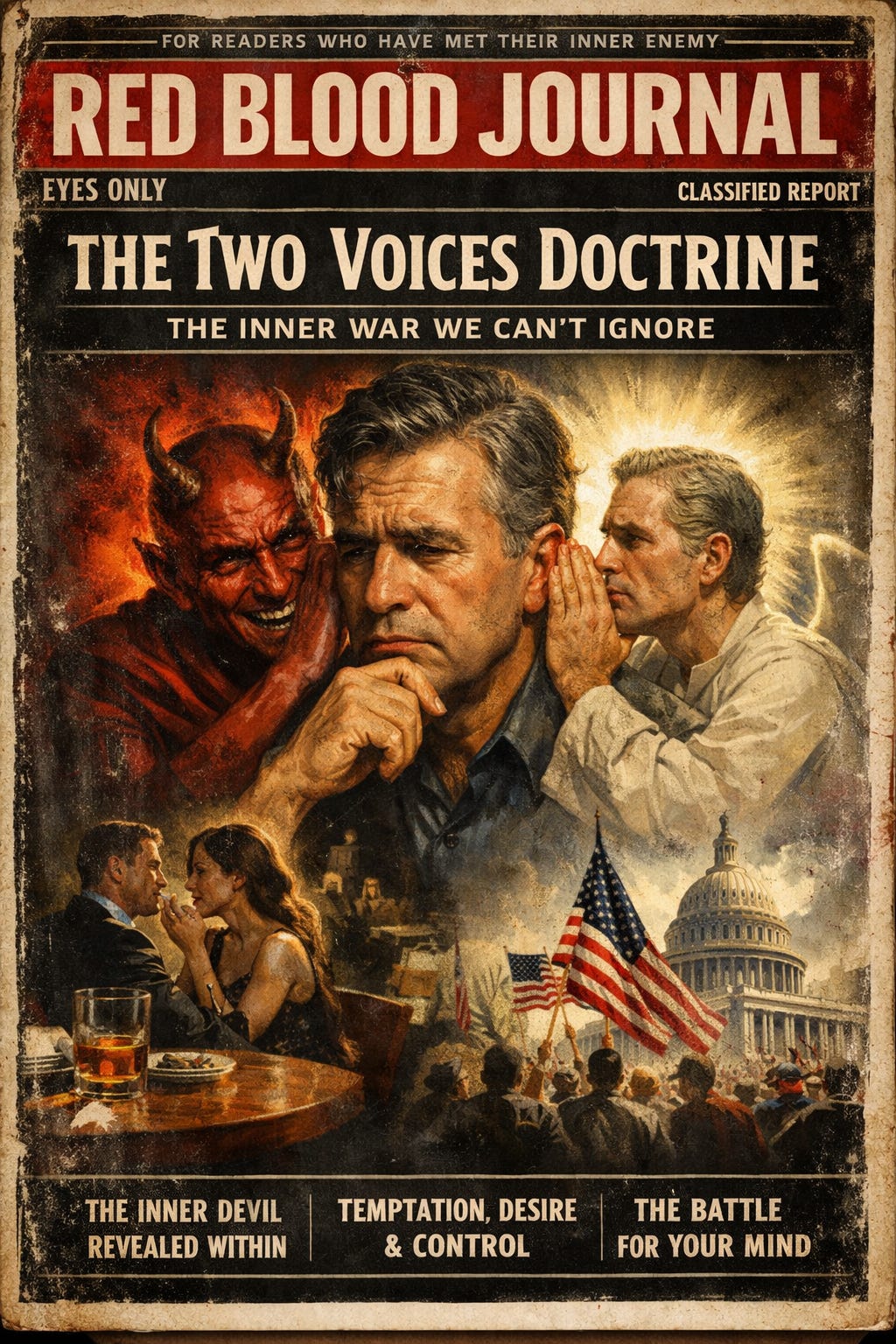 This text introduces the Two Voices Doctrine, a psychological framework that conceptualizes the human mind as a battlefield between conflicting internal impulses.
