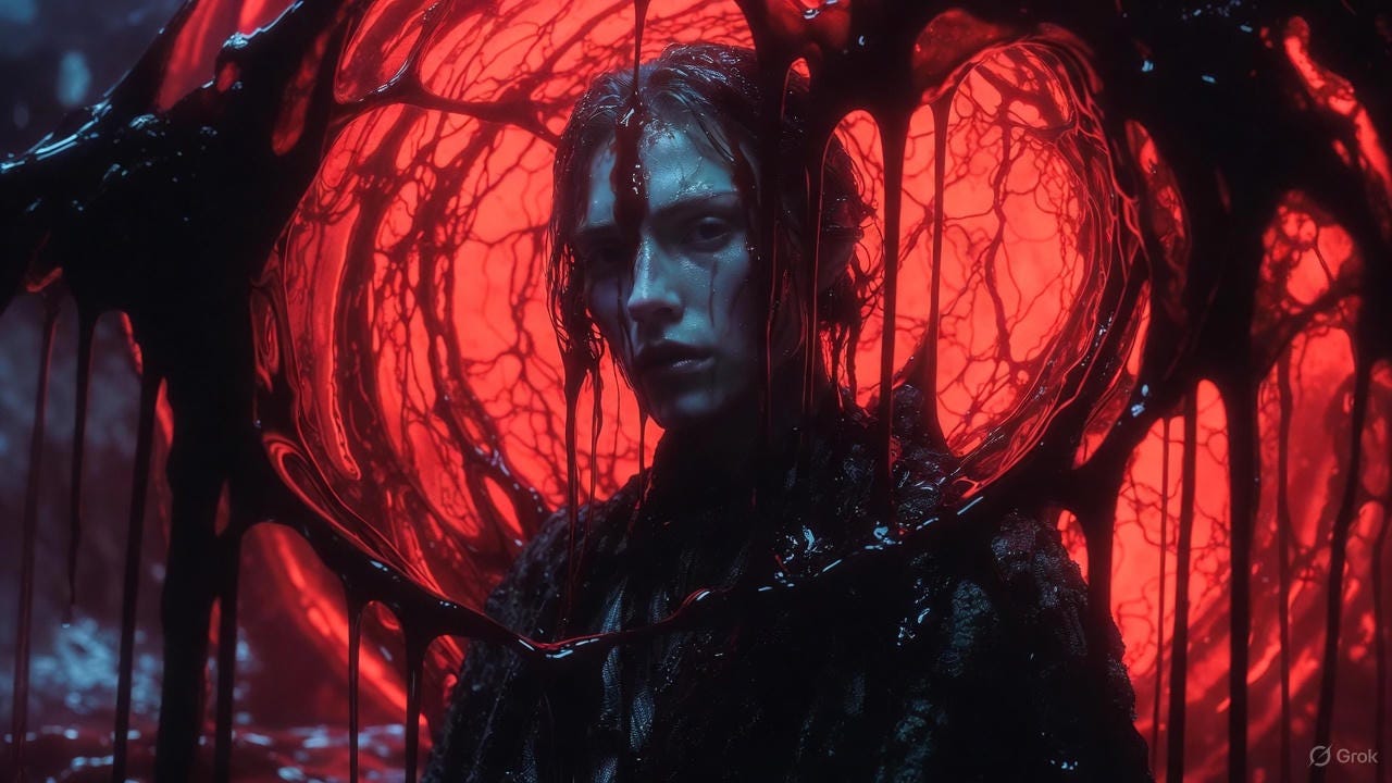 It does not bleed, yet it is sustained by blood. Our blood. It has pulsed through the arteries of time for millennia beyond count, traversing eras as a clot moves through veins—forward to taste futures unborn, backward to staunch the hemorrhages of the past. Immortal, vast, its form a writhing coalescence of shadowed flesh and crimson ichor, eyes like coagulated stars, tendrils that pierce realities and draw forth the vital red flow.