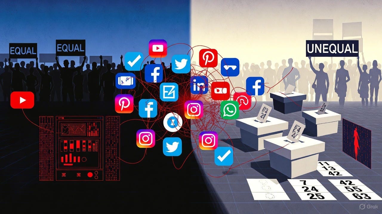 Social Media as the Pulse: Over 5.4 billion users worldwide, yet 83% of Americans believe platforms intentionally censor viewpoints (Pew Research, 2024). Algorithms act as unelected gatekeepers, amplifying extremes via “likes” that mimic votes – creating echo chambers akin to gerrymandered districts. Initial upvotes boost content by 25-32% through bandwagon effects, mirroring electoral momentum swings. Bots and paid engagement distort reality, just as foreign interference or voter suppression taints ballots.