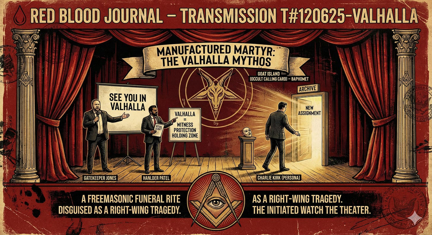 This Valhalla saga—Kash Patel’s “See you in Valhalla,” Alex Jones parroting it hours earlier, Goat Island, the goat symbolism, the 33-hour manhunt—is not an accident and not a coincidence.