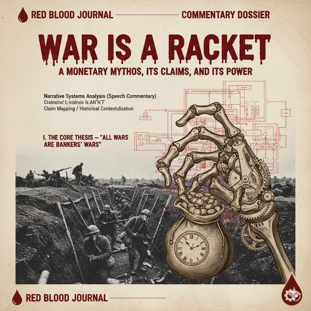 The provided source is a Commentary Dossier from the Red Blood Journal offering a Narrative Systems Analysis of a popular circulating speech titled “War Is a Racket: A Monetary Mythos.”