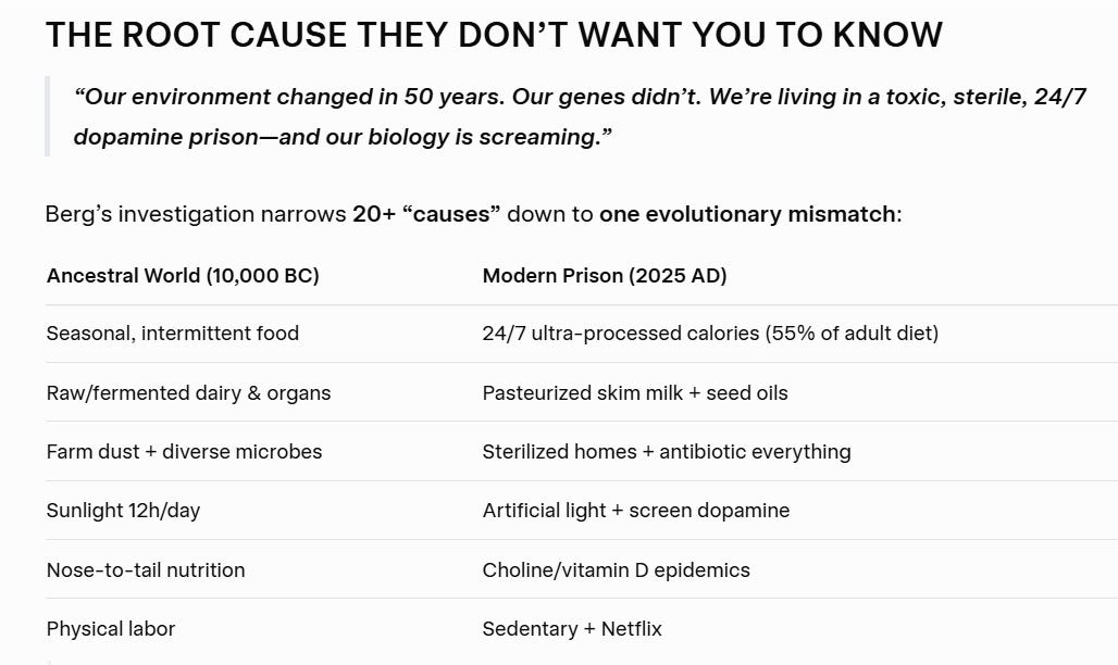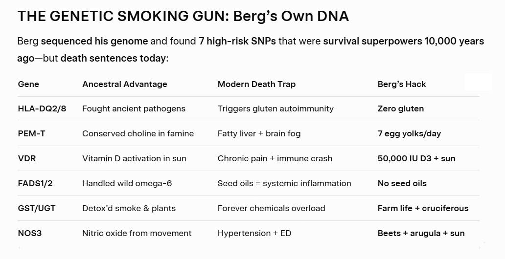 Berg sequenced his genome and found 7 high-risk SNPs that were survival superpowers 10,000 years ago—but death sentences today:“I was a crippled 20-year-old on junk food. At 60, I’m stronger than ever—because I stopped fighting my genes and started aligning with them.”